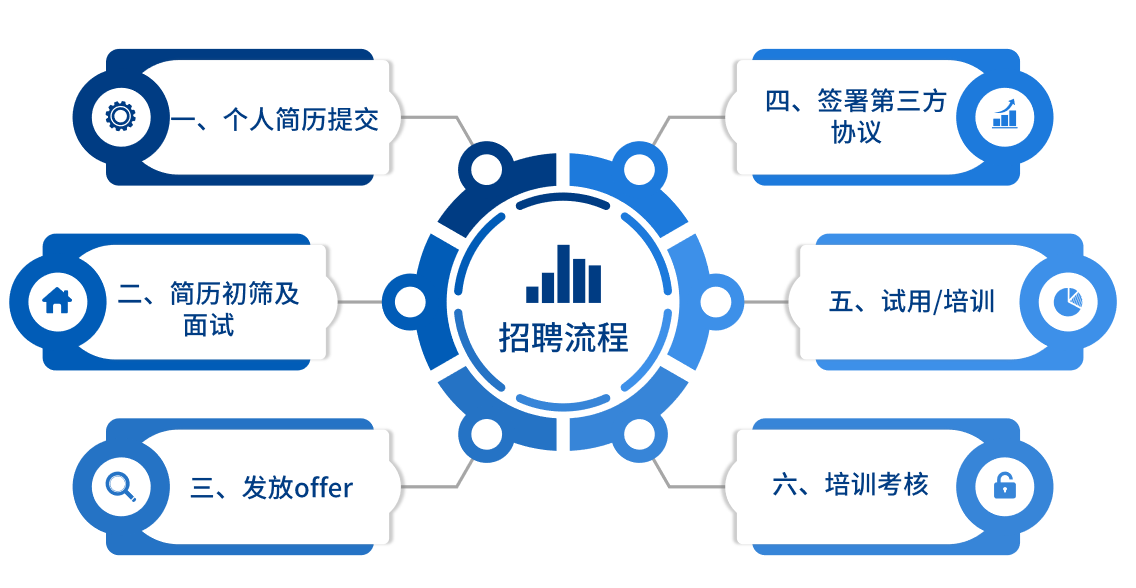 個人簡歷提交—簡歷初篩——面試——發(fā)放offer——簽署三方協(xié)議——試用/實習——培訓、考核。